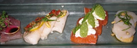 We stopped for a drink and just to try the signature dish – the crudo. They were very nice about accommodating us at the bar, where we could watch them shuck oysters and prepare the dishes. Pictured was the house variety; there were three of us and they offered a combo of 3 pieces each. It took us 4 tries to find a bottle of European white wine from the list that they had in stock. Finally went with an obscure Italian varietal that was just ok at $45. Pictured below are the salmon, scallop, tombu tuna, and I think a kompachi. As we tasted them, they went from ok to not so great. The sauces overpowered the fish, the fish not that impressive. It was also sliced unevenly. Not pictured was the ono, which we got ala carte. I tasted it and the fish was actually bad. My friends were grateful I was able to save them from the yuckiness.