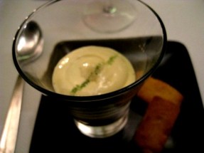 We loved Alinea in Chicago, and since that experience have been questing other great Molecular Gastronomic experiences. I had heard that Coi (pronounced “kwa”) is the best (only) experience SF has to offer in Molecular Gastromony…(meaning they have exactly one more option than LA…) so of course this was at the top of my list. There were five of us. #5 just got his pilot’s license that day so we were also celebrating his triumph. The wine was inadvertently themed…they were all from the 2000 vintage. First a Vietti Barbaresco, then a Altesino Brunello, then an Arrowood Cab. We brought 2 bottles and purchased the Altesino was from the wine list. I had prearranged the purchase a few days before so they could decant it for 3 hours. It was a great value at $130 and I think the favorite of the table, but it was a really tough call vs the vietti…oh well, on to the food!