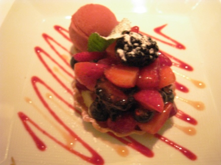 Course 6: A lovely tart with incredible fresh fruit (berries) and just the right amount of sweet. And in November! The sorbet on the side was seated on a small chocolate chip cookie. This was a great and refreshing dessert. The only problem was a saw some souffles on some adjoining tables and really wanted one of those. Oh well, maybe next time.