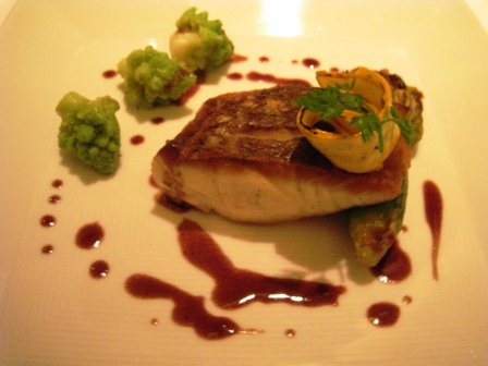Course 4: Dorade accompanied by broccoli/cauliflower florets. This was probably everyone’s least favorite; it was perfectly prepared, with a nice carmelization on the outside and brilliant fluffy white flesh in the middle, but it was just a bit too fishy in flavor. I blame the fish more than the chef to be honest.