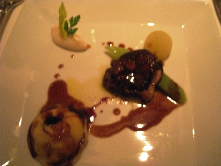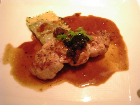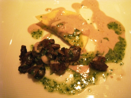 Course 3: A wild mushroom ravioli accompanied the escargot already removed from the shell. There was butter here, but also the realization that it was used much more sparingly than I would have expected. The ravioli actually came out cold and a bit undercooked, but a few words to the server and it was remade perfectly without complaint.