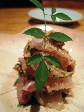 Hamachi Ume-Goma: Yellowtail with sour plum and sesame. This was one of our favorite dishes of the evening. I never experienced a combination of flavors quite like this. Pricey at $15.95.