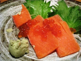 Next item: Salmon Luibe: Frost Japanese Salmon Sashimi and Salmon Roe. $12.95. So my Japanese is not very good and I thought “Frost” was some kind of Japanese exotic preparation of some sort. Nope, frost means frost. The salmon came out frozen, like what you get in Korean Sushi Bars. Plus, they forgot the Ikura so we had to send it back. That is why you see a half slice on the plate.