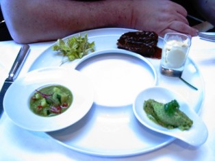 A decomposed dish as you can see from the picture. We could not eat either the guacamole or gazpacho as the taste and texture was mealy and the flavors were very Vons hummus. The salad was nice. We could have both sworn the corn sorbet was uni, but the waiter said (well implied, anyway) we were nuts. The veal cheek itself was braised nicely but overall unremarkable.