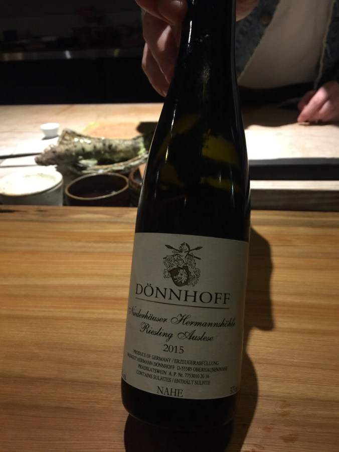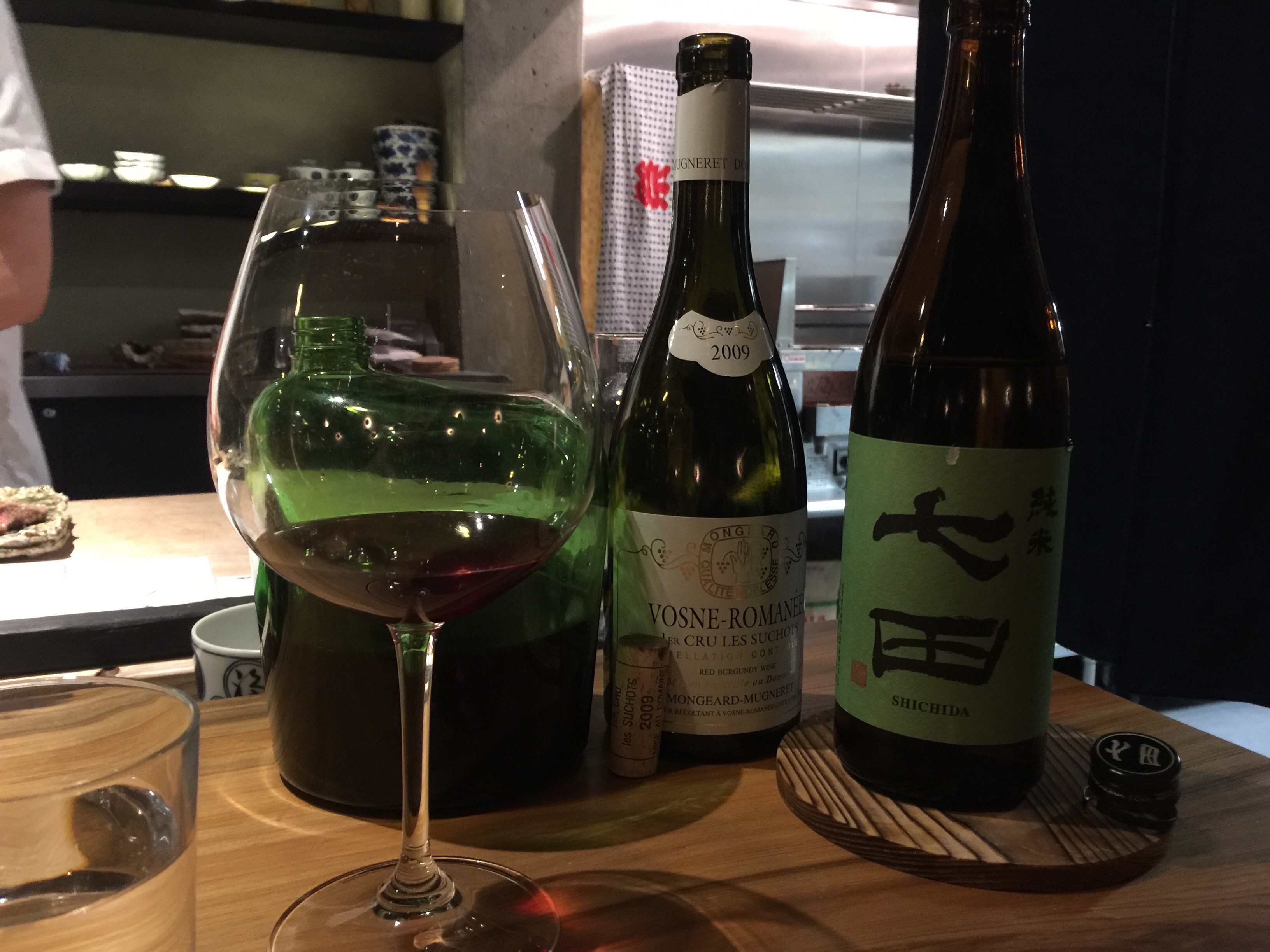 So we went for our 30th anniversary of our first date. I was happy to be able to change our 9:30 reservation to a more sane 8:30. Vosne Romanee burg in hand, we opted to pay the reasonable $25 corkage and order some Sake off the menu. American Express Platinum, besides getting us a better reservation time, also arranged for us to have what we considered the best seat of the house, counter seats on the right where all the kitchen action is going on. At a Kappo, this is ideal as one of the most enjoyable parts of the evening is interacting with the Chef and staff as well as enjoying the food.