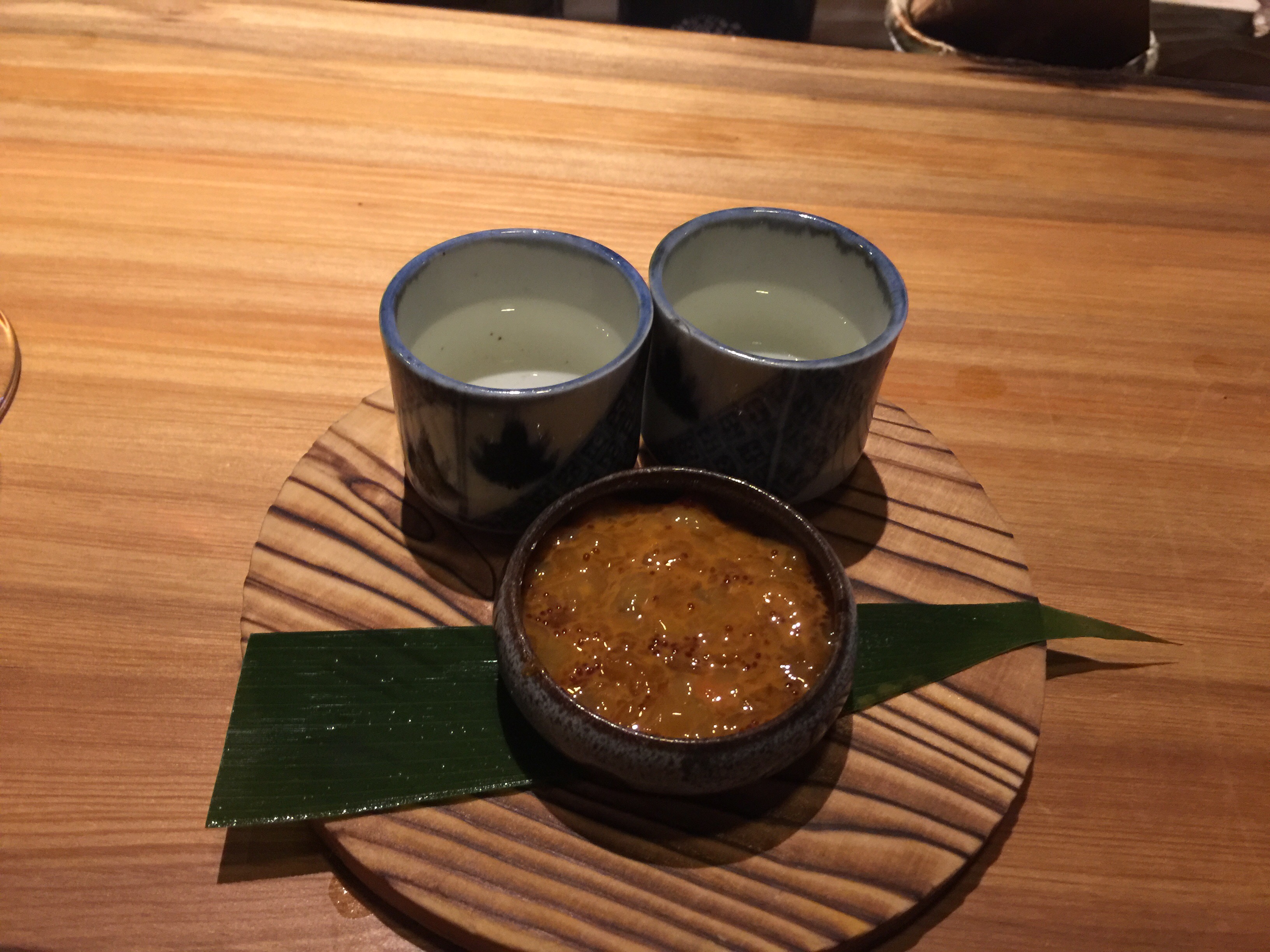 Raw Santa Barbara Prawns and Lobster marinated in Sake and “guts.” – (Shiokara) an addicting umani-filled dish. We could have eaten 5 of these