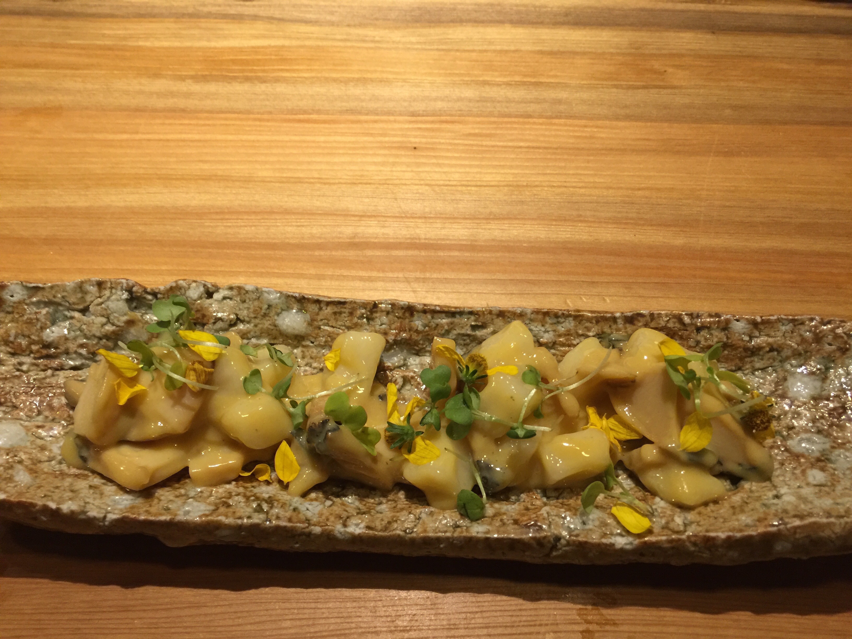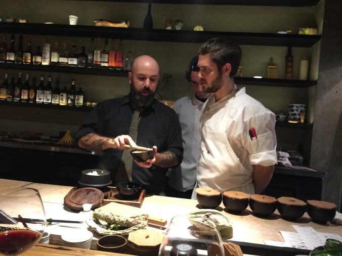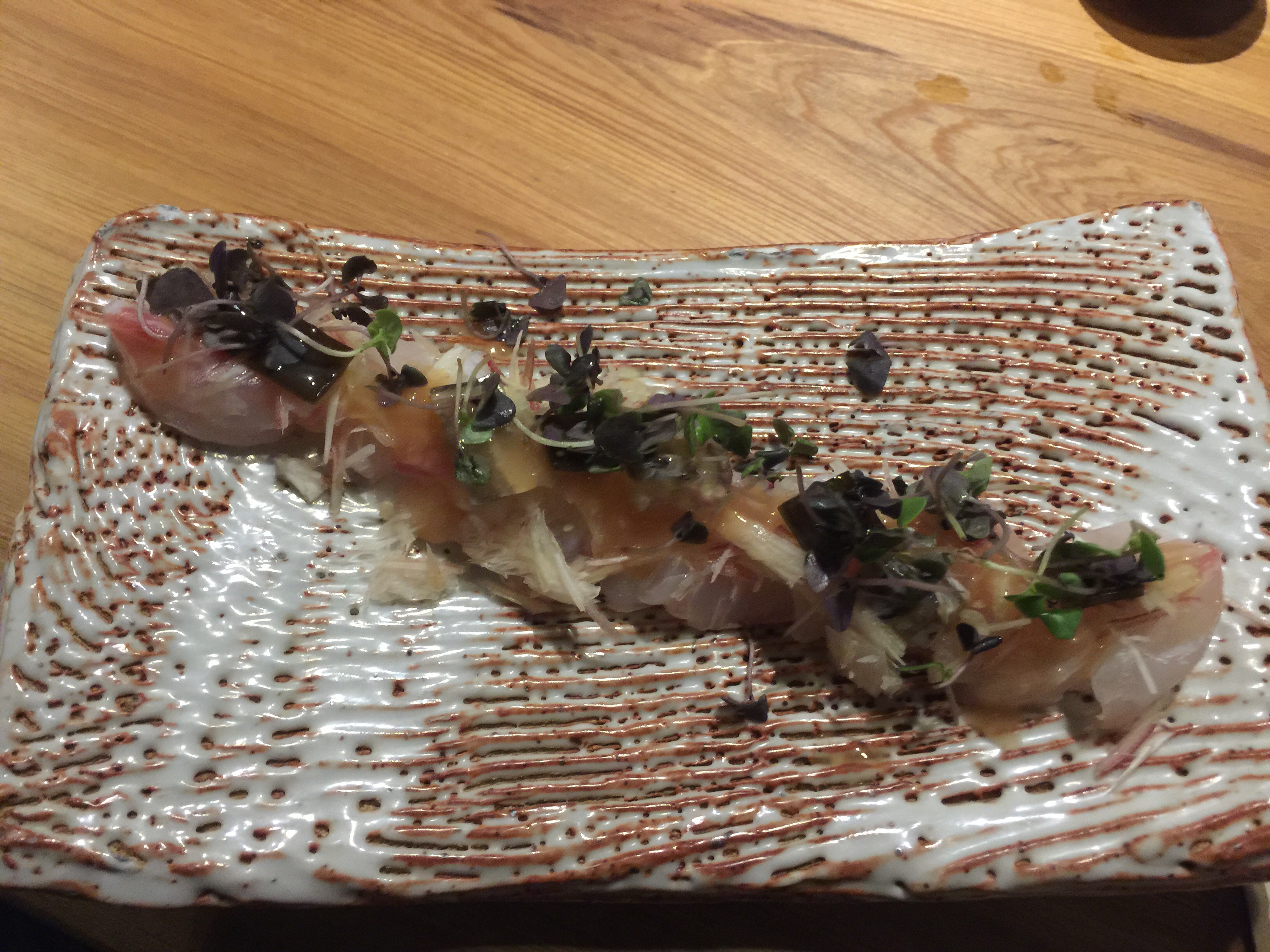 Then my fellow Japanese food snob hubby and I began the assessment. The restaurant is tiny with a handful of tables and a counter that seats about 15 or so. At first glance, it looked any other hipster joint downtown, and that fit the description of who was seated at the tables. I asked about the Sake and a very sharp, well-informed gentleman was able to go into great detail on all the options and steered us to get one I would not have typically ordered and it was perfect. He is studying to become a Sake Sommelier and he knew my famous friend Yukari Sakamoto (Food, Sake, Tokyo author) well. First test passed with flying colors! Then I gently stirred the waters a bit with offering up a standard greeting in Japanese. Chef’s face lit up and we engaged in conversation. We regaled him of our recent travels all over Japan, he was interested and asked a lot of questions. He shared his Japanese travels and experiences as well as his philosophy with us. We knew there would be no more tests needed even before we tasted the food.