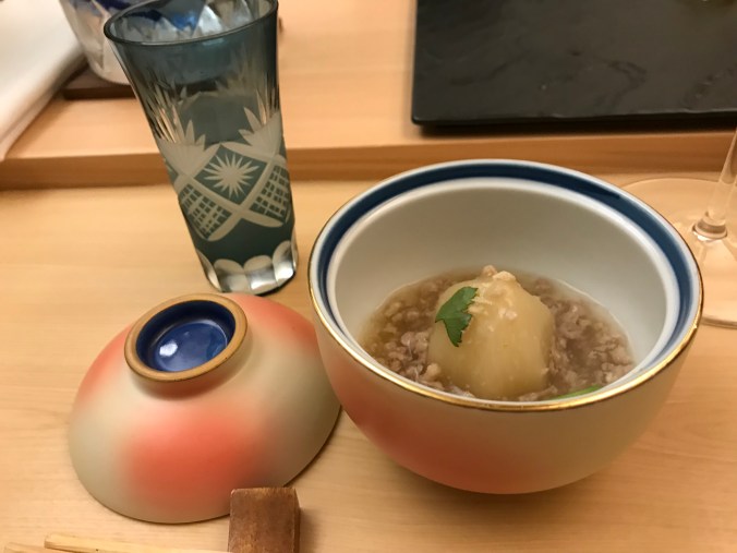Truly delectable ground chicken in a kudzu-thickened Dashi with a turnip