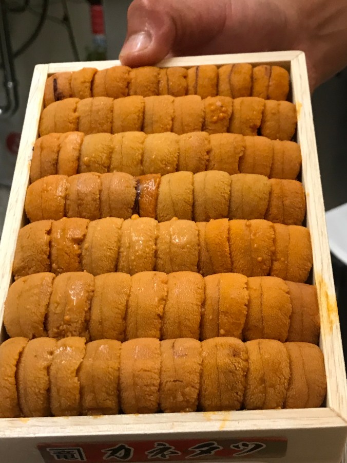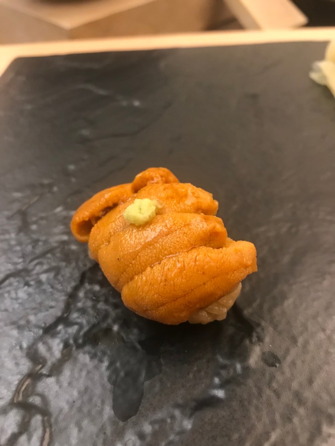 Crab Tomalley/Brains, Halibut wrapped Hokkaido Uni, Spicy Konbu (amazing Umami)